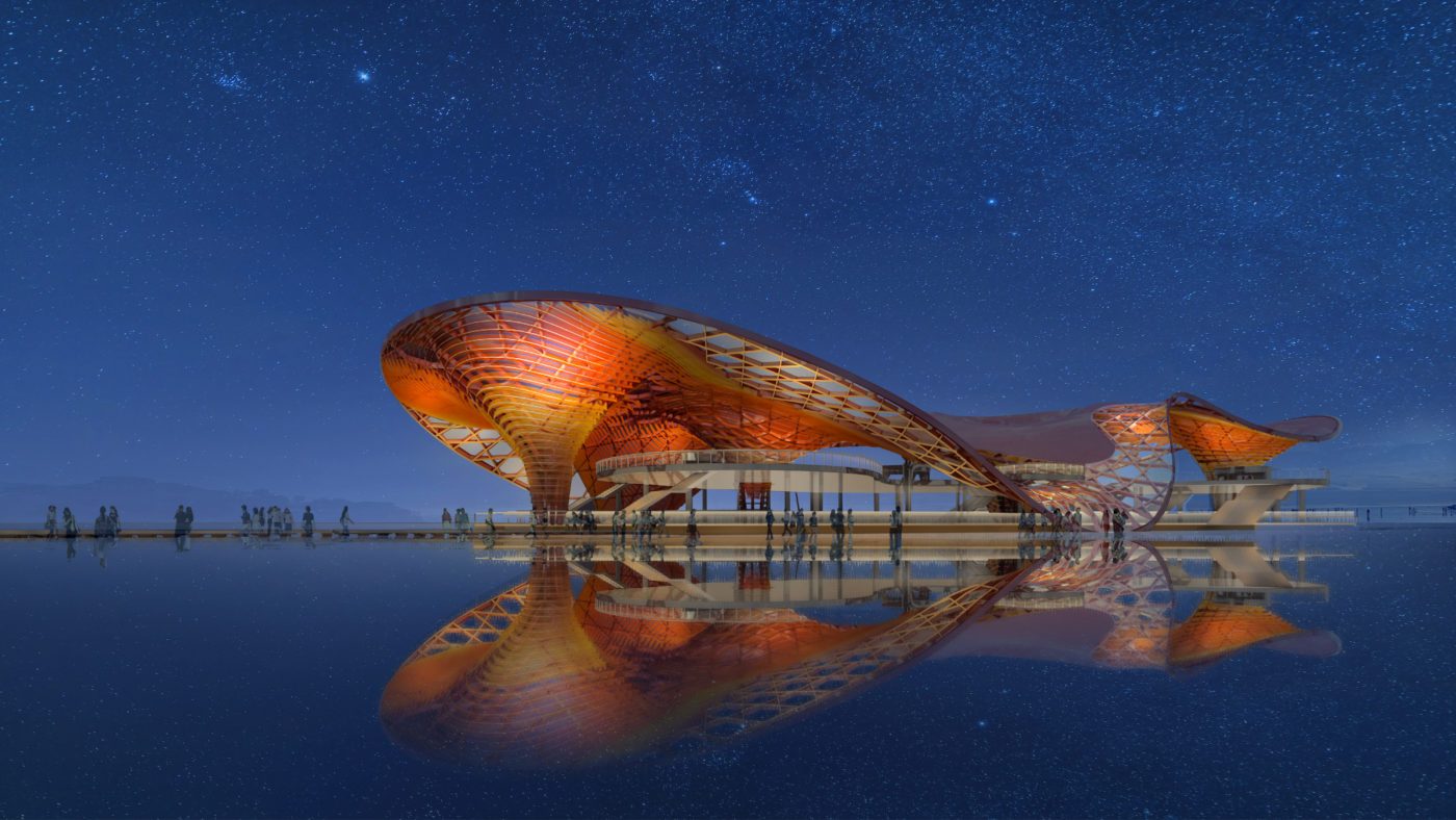 Musée modulaire translucide — petit bâtiment contemporain