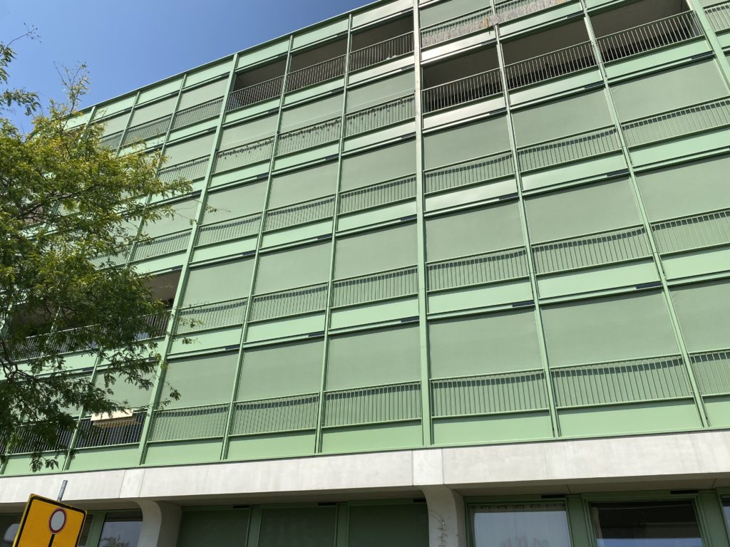 At the heart of the solar shading system is Soltis 86 Moss Green, a high-performance fabric by Serge Ferrari. This choice was not only functional but also aesthetic: the green tones harmonize beautifully with the building’s color scheme and surrounding environment.