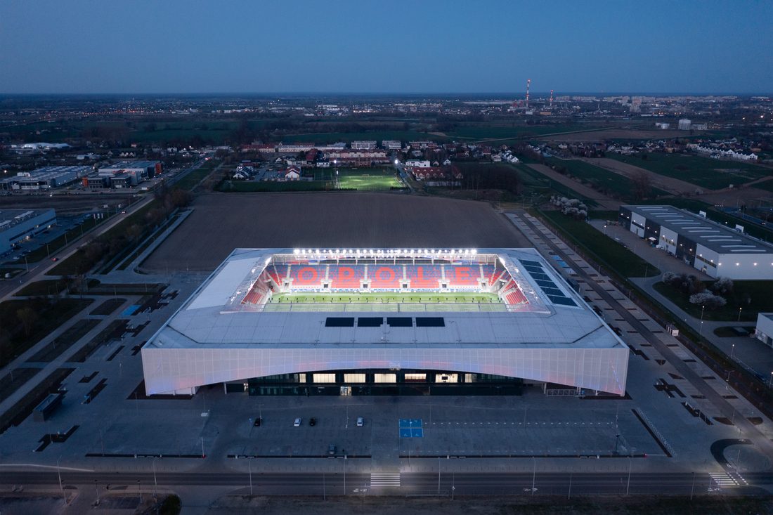Designed by 90 Architekci and GMT, the new Stadium of Odra Opole has been built to UEFA’s Category 3 specifications, making it eligible for hosting the League of Champions and the Europa League qualifiers. With a total capacity of 11,600 seats arranged into 18 rows stretching continuously around the pitch, the design relies on a compact and dynamic structure, supported by no less than 130 load-bearing columns. Most importantly, the project shows a strong sustainable commitment: rooftop solar arrays, heat pumps, CHP units to power the building, and a complete rainwater harvesting system to irrigate the pitch and supply water to all the lavatories. The building is also equipped with full a range of cutting-edge sound, video and lighting technology, delivering both optimal quality and energy efficiency.