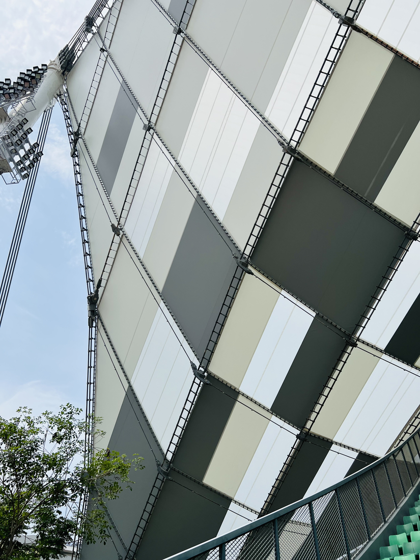 The stadium is the centerpiece of the project. Its curved roof, combining steel and textile, spans 170 meters with a maximum height of 50 meters. Three PTFE fiberglass membranes from Serge Ferrari were selected for the roof: Tenseo GF7000 (an opaque grey membrane), Tenseo GF7000 (a semi-transparent fabric), and Tenseo GFM-52.LT (a highly translucent mesh). This system ensures solar protection, visual comfort, and structural lightness.