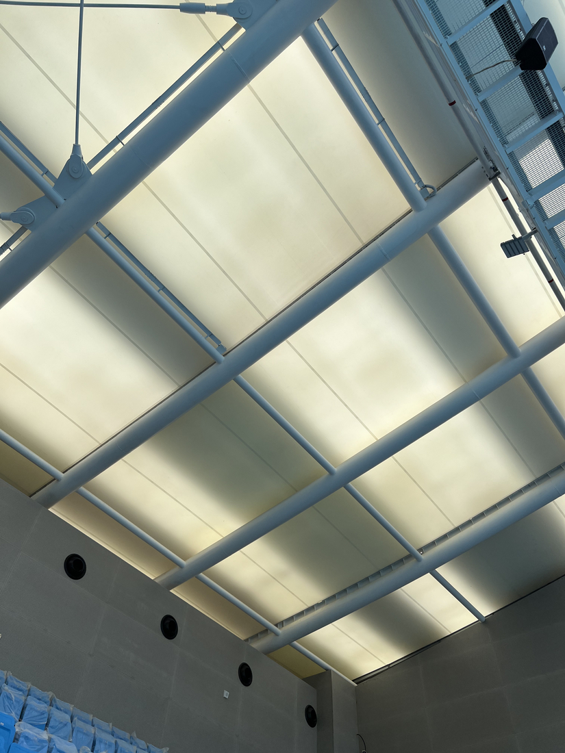 The gymnasium and swimming pool focus more on user comfort. They adopt a multilayer system consisting of an outer membrane, an aerogel insulation layer, and an inner membrane. This configuration delivers performances comparable to those of a traditional envelope while remaining lightweight. Alphalia Aw: a highly transparent acoustic inner membrane, used in the gymnasium to combine sound comfort and brightness. Flexlight 402HT: a luminous inner membrane, used in the swimming pool to create a warm atmosphere.