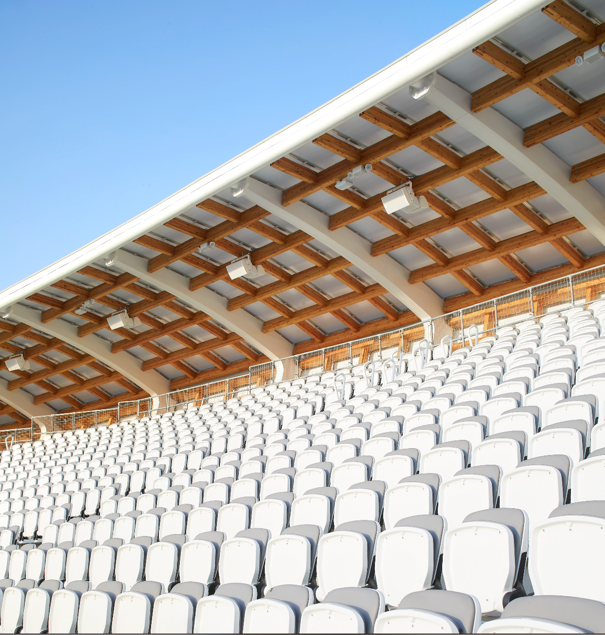 Interior view of tensile roof panels above stadium seating rows.